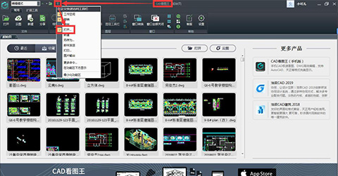 第五種:打開浩辰CAD看圖王(電腦版)之后,點擊左上角的logo,出來的下拉菜單欄中可以調用【打開】功能。