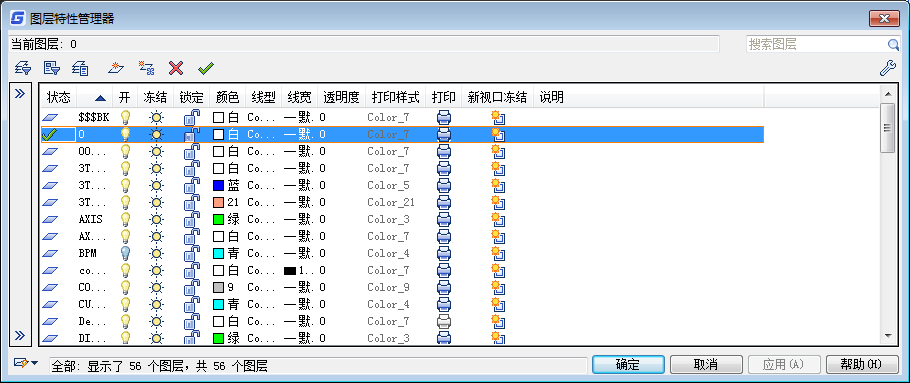 在CAD中使用“圖層特性管理器”可以創建圖層、刪除圖層、設置當前層及設置圖層的狀態、名稱、打開/關閉、凍結/解凍、鎖定/解鎖、線型、顏色、線寬和打印樣式等各種特性,還可以對圖層進行更多的設置與管理,如圖層的切換、重命名等,并且可以創建特性過濾器和組過濾器。
