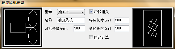 2、軸流風機型號、名稱等參數均可手動指定,同時軸流風機與風管連接處的軟接頭和天圓地方等局部構件,也可通過該功能自動計算和生成;