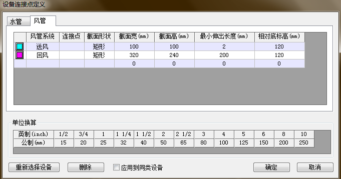 1、可以定義設備默認的連管類型,比如定義風機默認的連接風管類型,定義水泵默認的連接水管類型;