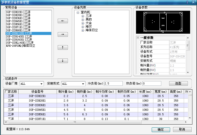 ②增加四個過濾條件:設備廠商,安裝形式,冷負荷和熱負荷。在下方列表中顯示選型結果。選擇某一設備可以計算出該設備的冷負荷的配置率。列表具有排序功能。