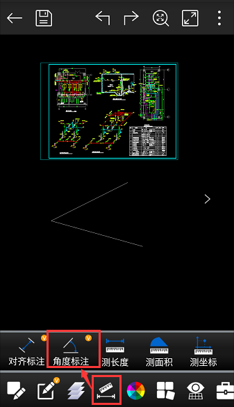 手指抬起后,顯示角度標(biāo)注和調(diào)整標(biāo)注位置的箭頭,拖動(dòng)箭頭調(diào)整標(biāo)注弧線的位置。