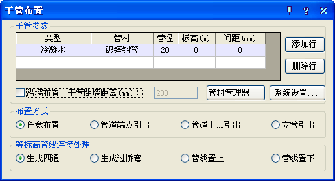 10.等標高管線連接處理:對繪制過程中與其他等標高管線相交的情況,提供四種處理方式:生成四通、生成過橋彎、管線置上和管線置下;