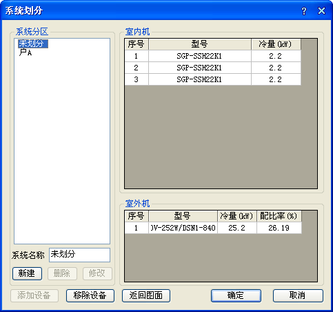 1、自動獲取圖中所有的室內機和室外機,如果有些設備曾經被劃分過系統(tǒng),則可以識別出所屬系統(tǒng);所有未被劃分過的設備均歸類于“未劃分”;