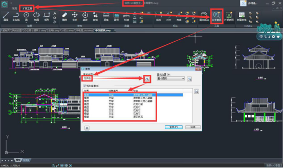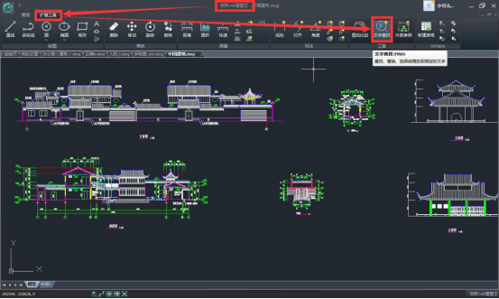 而新發(fā)布的浩辰CAD看圖王4.1版本中,在界面上方特地增加了文字查找功能的入口,自從大家就可以直觀的看到文字查找功能了,如下圖所示,文字查找功能就在浩辰CAD看圖王電腦版擴(kuò)展工具菜單下的工具欄中: