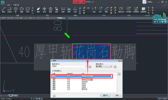 點(diǎn)擊【文字查找】功能之后就會調(diào)出如下圖所示的查找對話框,在對話框上方輸入查找的文字內(nèi)容,點(diǎn)擊后面的查找按鈕,圖紙中所有包含查找內(nèi)容的文字就都顯示在下方的列表中了。