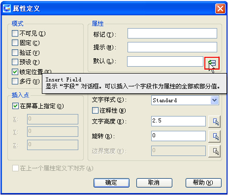 如果要把字段插入普通的文字中間,在寫單行文字和多行文字時(shí)右鍵,右鍵中都會(huì)有插入字段的功能。如果圖框的標(biāo)題欄用的是屬性塊,也可以在定義屬性文字時(shí)插入字段。屬性定義對(duì)話框的屬性值的后面有一個(gè)插入字段的按鈕,點(diǎn)此按鈕可以在屬性中插入字段,如下圖所示。