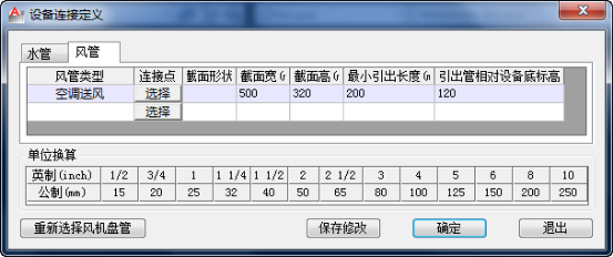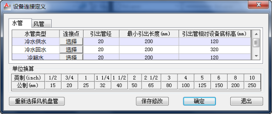 1.選擇定義的圖塊,“設(shè)備連接定義”對(duì)話框中可設(shè)置風(fēng)管連接位置,方向,尺寸及水管連接位置方向,管徑等;