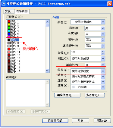 要想按圖中設(shè)置的線(xiàn)寬打印,必須使用打印樣式表(CTB或STB),并且在對(duì)應(yīng)顏色或?qū)?yīng)樣式的輸出的線(xiàn)寬設(shè)置中選擇“使用實(shí)體”線(xiàn)寬,CTB文件設(shè)置如下圖所示。