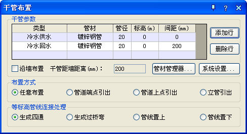 浩辰cad暖通智能水路設計中提供了強大的干管布置功能。布置界面的設置功能使得點選參數即可畫出符合設計人員要求的圖紙。布置方式有任意布置、管道端點引出、管道上點引出、立管引出等。干管布置時候還可以設置好等標高管線連接處理。本文介紹業精于勤,浩辰暖通智能水路如何布置干管