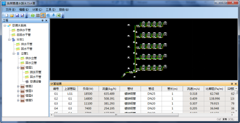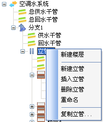 工程信息處,是空調(diào)水路系統(tǒng)的管路模型,其參數(shù)包括:總供回水干管、分支、供回水干管、立管、立管作用樓層數(shù),以及各樓層連接設(shè)備信息,用戶在對工程模型的確定時,可以通過本章節(jié)中新建,或是按上述介紹中手動通過右鍵菜單的相關(guān)選項完成。