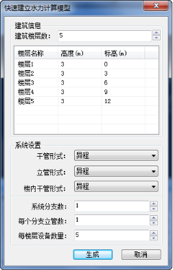 說明:可以輸入建筑信息和系統(tǒng)設(shè)置。建筑信息包括樓層數(shù)與各層標(biāo)高數(shù)值,用戶可以根據(jù)實際工程情況進(jìn)行建筑信息的手動輸入;系統(tǒng)設(shè)置除了可設(shè)置干管、立管的接管形式、樓內(nèi)干管形式,還可以確定系統(tǒng)分支數(shù)、每個分支立管數(shù)和每樓層內(nèi)設(shè)備數(shù)量。