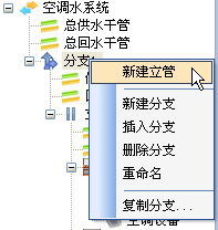 用戶可以按文字提示,新建樓層;新建或刪除立管,也可以對立管重新命名;右鍵中“復(fù)制立管”命令見本節(jié)編輯中的高級復(fù)制 ;另外,水力計算時,點(diǎn)【提取信息】按扭,在圖中拾取供水的起點(diǎn),以及回水的終點(diǎn),可以直接將平面圖中分支的信息讀取到計算器當(dāng)中。
