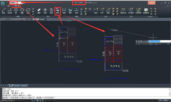步驟三:在圖紙中選擇需要復(fù)制的對(duì)象(如果是單個(gè)對(duì)象點(diǎn)擊即可選擇,如果是整體則使用框選),點(diǎn)擊【復(fù)制】命令,指定復(fù)制點(diǎn)位置進(jìn)行復(fù)制,復(fù)制完成后按esc鍵。