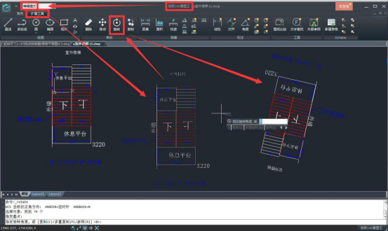 步驟四:在圖紙中選擇需要旋轉(zhuǎn)的對(duì)象(如果是單個(gè)對(duì)象點(diǎn)擊即可選擇,如果是整體則使用框選),點(diǎn)擊【旋轉(zhuǎn)】命令,指定旋轉(zhuǎn)基點(diǎn)進(jìn)行旋轉(zhuǎn)。