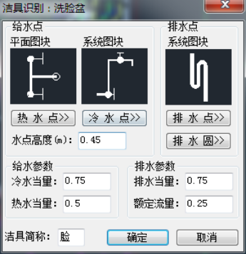 本功能是對軟件已知潔具圖塊選項的修改與補(bǔ)充,軟件對天正中的潔具已默認(rèn)識別,用戶可對非此類圖塊或參數(shù)修改,以方便后續(xù)的潔具連接和水力計算等工作。