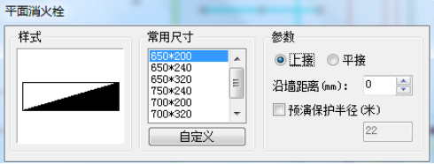 用戶在對話框中確定消火栓的樣式和尺寸,當(dāng)選擇沿墻布置時(shí)沿墻距離起作用,設(shè)置保護(hù)半徑,然后在圖中進(jìn)行消火栓的布置。