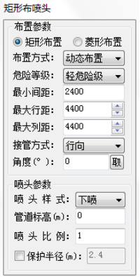 用戶可對布置形式、接管方式、噴頭形式、管道標高、噴頭比例等進行設置。布置形式包括“動態(tài)布置”、“行列布置”、“定距布置”三種布置方式。