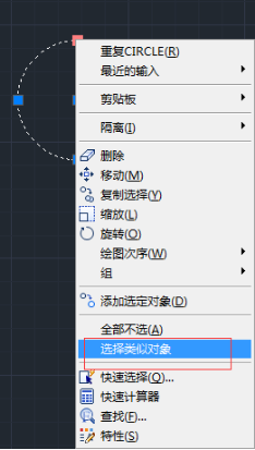 當選擇了一個對象后,右鍵菜單中會提供類似對象和全部不選的選項。選擇類似對象可用于選取同類型的對象和同名的圖塊,個人覺得還是比較有用的,例如我要選擇圖中所有圓,我只選擇一個圓,然后在右鍵菜單中選擇“選擇類似對象”,就可以將所有圓都選中。我們需要統計某種圖塊的數量或者全部刪除某種圖塊的時候也這個功能也很方便。