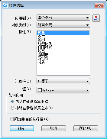 快速選擇的命令是Qselect,也可以點屬性框右上角的快速選擇按鈕直接調用這命令。打開對話框后,可以設置應用范圍、對象類型、用于過濾的參數和參數值以及應用方式。