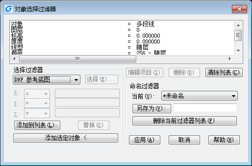 對象選擇過濾器跟快速選擇有些類似,不同的是:對象選擇歐律器可以設置多個條件,而且可以拾取圖中對象來獲取條件,然后再刪除多余的條件;設置好過濾器后可以保存,下次選擇的時候還可以再用。