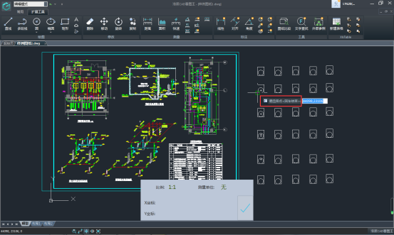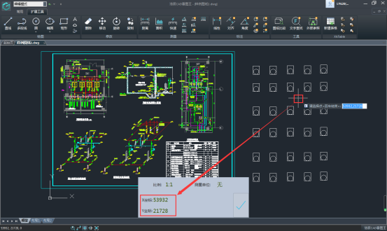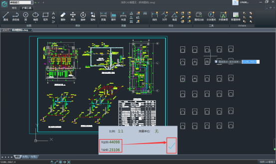 圖紙上某個點的測量坐標結(jié)果顯示在下方陰影處,下方的數(shù)據(jù)會根據(jù)點的不同而隨時更新點的坐標,同時,點擊右側(cè)的“√”號,可以將測量的坐標保存在側(cè)量記錄中,方便之后的查看。