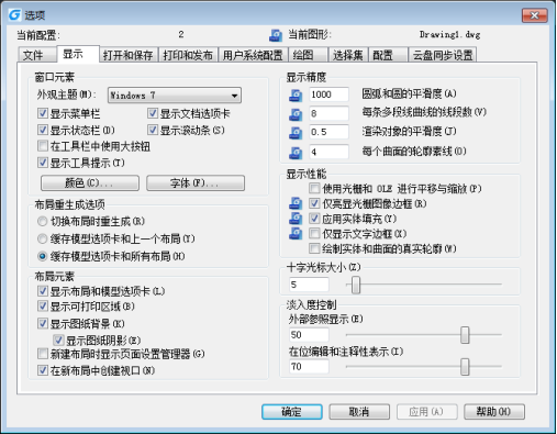 顯示精度:提高此欄相關(guān)選項(xiàng)的值,可以提高CAD的顯示效果,CAD圓弧會(huì)更圓,曲線會(huì)更平滑,但同時(shí)也會(huì)消耗更多的硬件資源。對(duì)于電腦的處理器、顯卡比較好的朋友,可以適當(dāng)提高顯示精度,而如果追求操作的速度,使用軟件默認(rèn)設(shè)置即可!