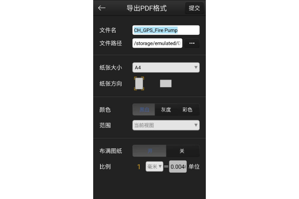 以導(dǎo)出功能為例,在看圖紙的同時還可以將圖紙以PDF或者圖片的形式導(dǎo)出,具有這個功能,可以保證圖紙傳送給別人不會被修改。在導(dǎo)出PDF格式時,還設(shè)置了文件名、文件存儲路徑、紙張大小、紙張方向、顏色、還可以選擇范圍、是否布滿圖紙、比例。