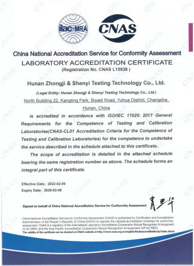 近日,湖南中機申億檢測技術(shù)有限公司獲得中國合格評定國家認(rèn)可委員會(CNAS)頒發(fā)的實驗室認(rèn)可證書(注冊號CNASL15938),檢測能力得到權(quán)威認(rèn)證,實現(xiàn)了檢測結(jié)果國際互認(rèn)。
