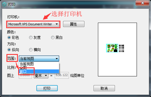 3、在打印對話中設(shè)置打印的相關(guān)內(nèi)容,選擇打印機,打印范圍的框選,選擇窗口;