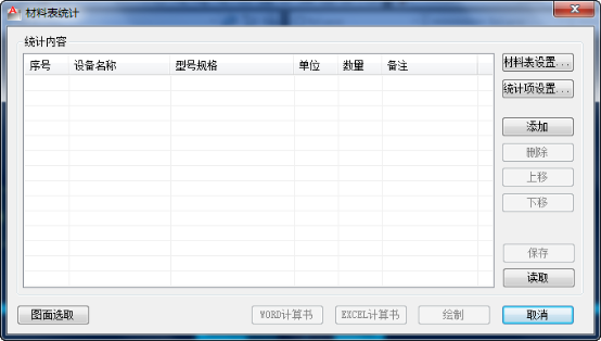 用戶可以設置材料表序號、設備名稱、型號規格、單位、數量、備注、材料表名稱、材料表生成方向、以及表格邊框線型等,在狀態欄顯示材料的主要參數。