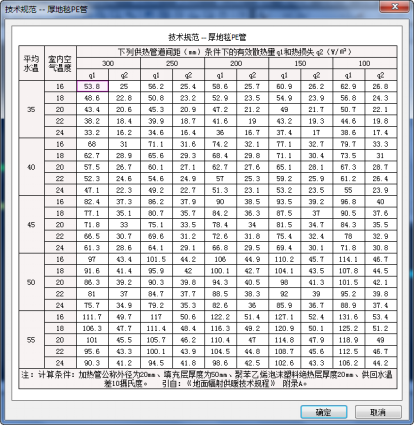 用戶不僅可以查到平均水溫和室內空氣溫度下,不同供熱管道間距的有效散熱量和熱損失。還可以查到其他的計算條件,包括加熱管公稱外徑、填充層厚度、絕緣層厚度、以及供回水設計計算溫差。