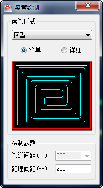 用戶可以在盤管形式中選擇簡單選項,在盤管形式下拉菜單中可以選擇多種形式的盤管,有回型、中回型、水平梳型、垂直梳型、水平蛇型、垂直蛇型、單回轉型、交叉型,共8種形式,圖示為回型;在繪制參數中可以選取管道間距,以及距墻間距的實際數值,在右邊下拉菜單中,系統列舉了管道間距的推薦取值。