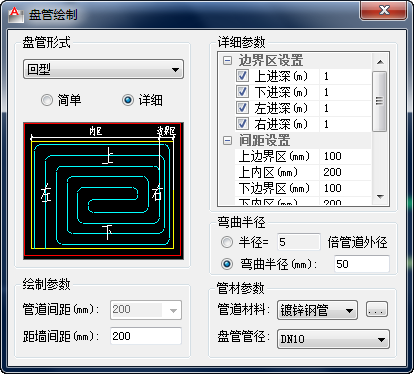 詳細繪制相比簡單繪制內容,多出了右側部分選項,用戶可以按照不同的盤管形式設置邊界區進深值,均為實際距離;按照不同的分區,可設置各區內的管盤間距、盤管的彎曲半徑;以及管材參數,用戶可在管材或管徑右方下拉菜單中可進行選取,也可通過旁邊按扭進入管材管徑管理器選取。