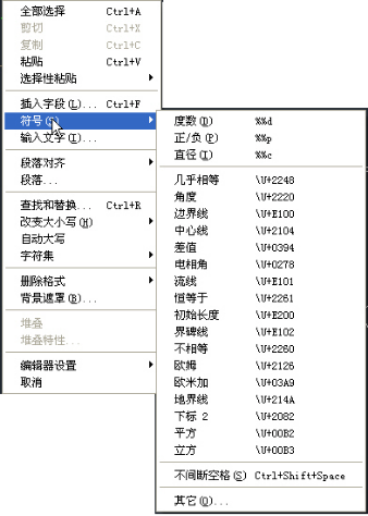 在CAD的多行文字中可以象Word一樣插入各種符號,可以在多行文字的右鍵菜單中選擇,如下圖所示。
