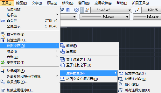 文字和標(biāo)注前置的命令是:注釋前置(TEXTTOFRONT ),如果使用經(jīng)典界面,可以在"工具"菜單中打開此命令,如下圖所示: