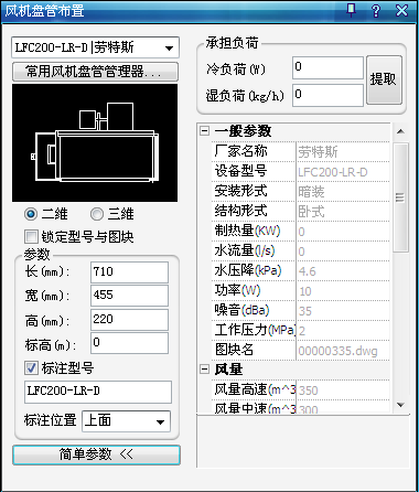 1. 風機盤管型號下拉列表提供常用的型號,可通過下面的按鈕連接到常用風機盤管管理器;